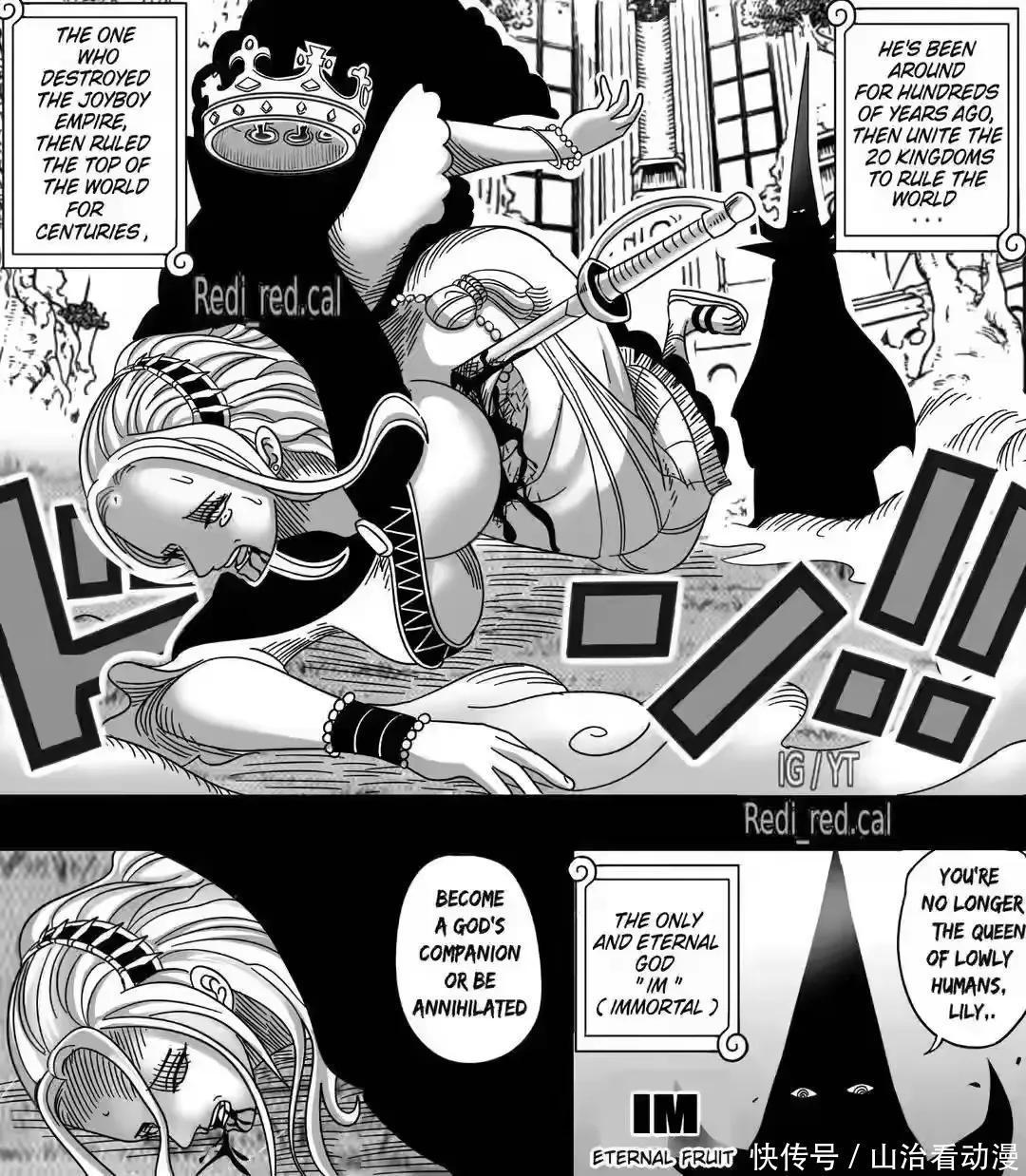 在八百年前,伊姆大人和乔伊波伊的战斗分出胜负,乔伊波伊最终战败,古代王国也覆灭了。二十位王建立了世界政府,他们掌控了这个世界,莉莉女王拒绝搬入圣地玛丽乔亚,还把历史正文散落到世界各地,伊姆大人发现后十分恼怒,她亲手抹杀了莉莉女王,应该是夺舍了莉莉女王的肉身。